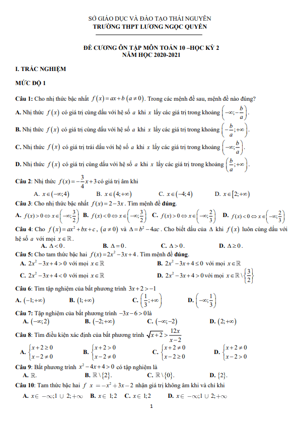 Đề cương HK2 Toán 10 năm 2020 – 2021 trường Lương Ngọc Quyến – Thái Nguyên