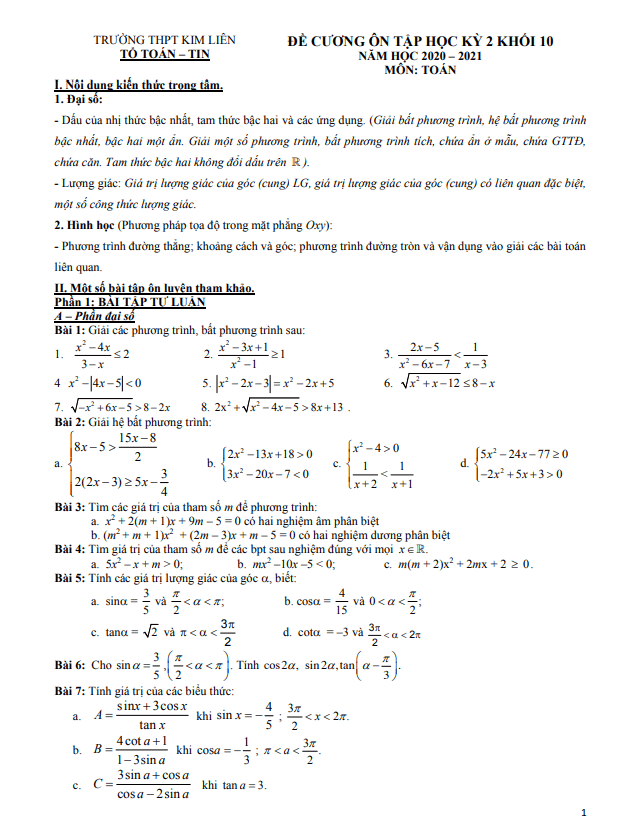 Đề cương ôn tập HK2 Toán 10 năm 2020 – 2021 trường THPT Kim Liên – Hà Nội
