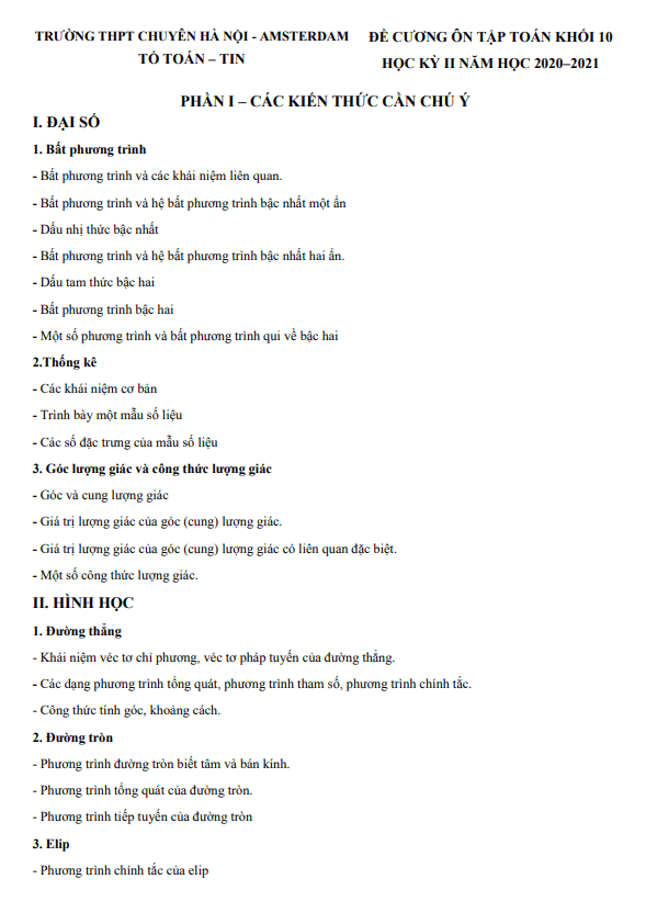Đề cương Toán 10 học kỳ 2 năm 2020 – 2021 trường chuyên Hà Nội – Amsterdam