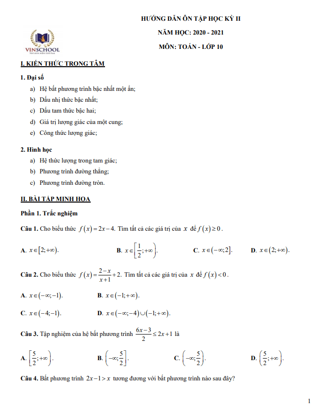 Hướng dẫn ôn tập học kì 2 Toán 10 năm 2020 – 2021 trường Vinschool – Hà Nội