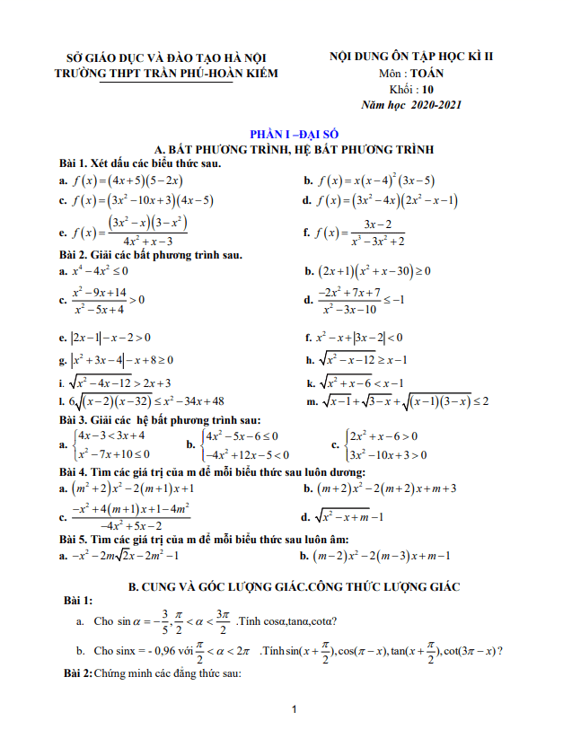 Nội dung ôn tập HK2 Toán 10 năm 2020 – 2021 trường THPT Trần Phú – Hà Nội