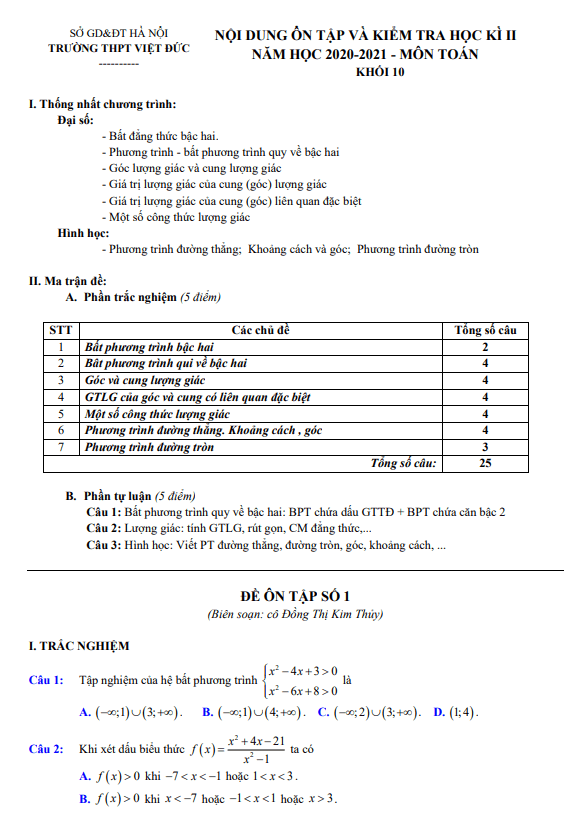 Nội dung ôn tập học kì 2 Toán 10 năm 2020 – 2021 trường THPT Việt Đức – Hà Nội