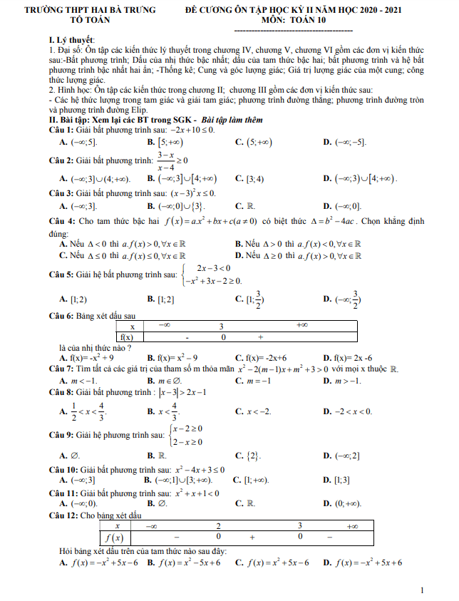 Đề cương học kỳ 2 Toán 10 năm 2020 – 2021 trường THPT Hai Bà Trưng – TT Huế