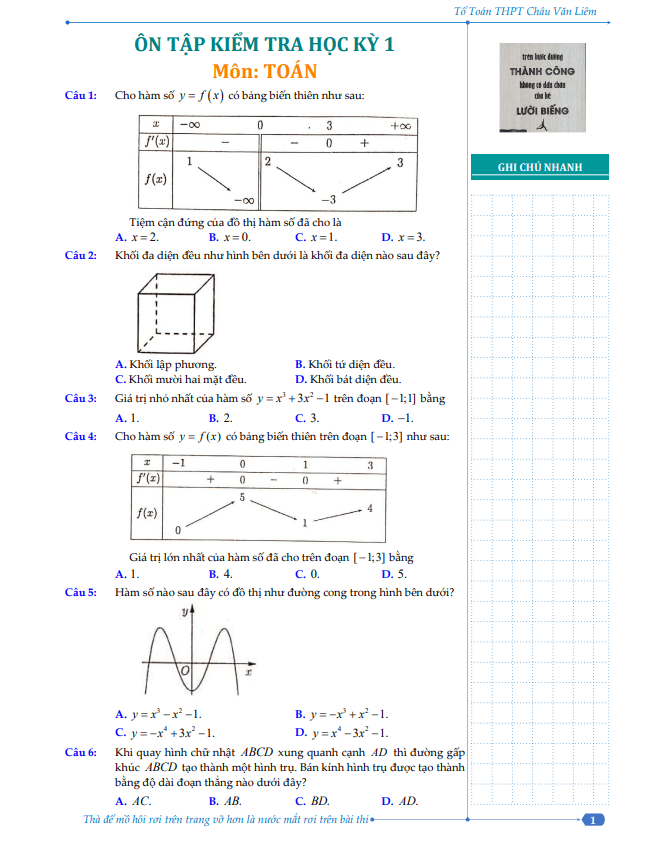 Đề cương học kỳ 1 Toán 12 năm 2023 – 2024 trường THPT Châu Văn Liêm – Cần Thơ