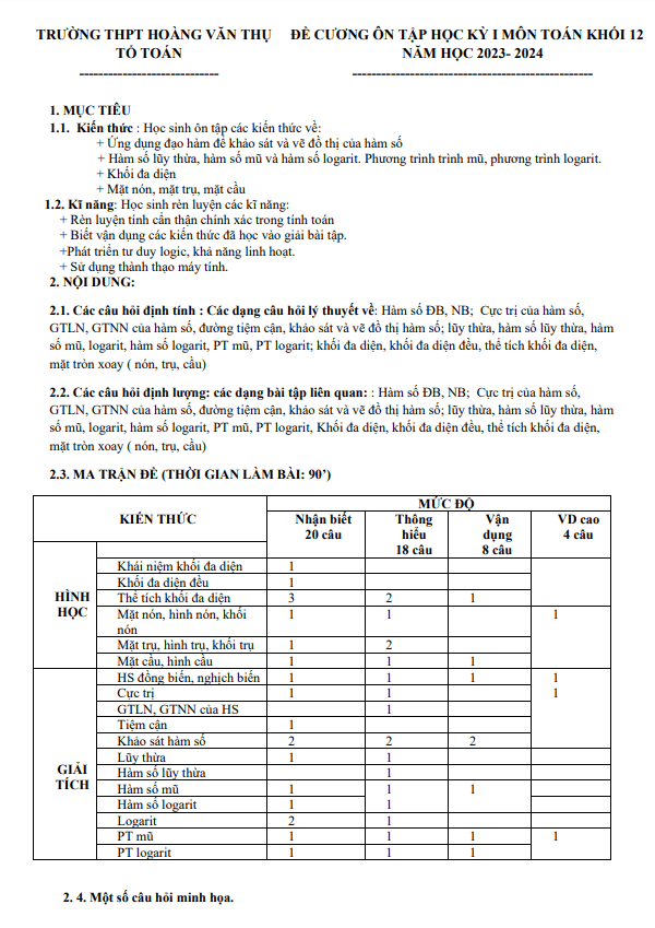 Đề cương học kỳ 1 Toán 12 năm 2023 – 2024 trường THPT Hoàng Văn Thụ – Hà Nội