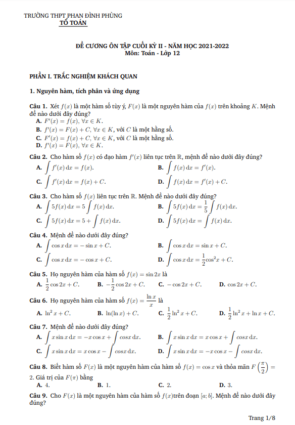 Đề cương cuối kỳ 2 Toán 12 năm 2021 – 2022 trường Phan Đình Phùng – Quảng Bình