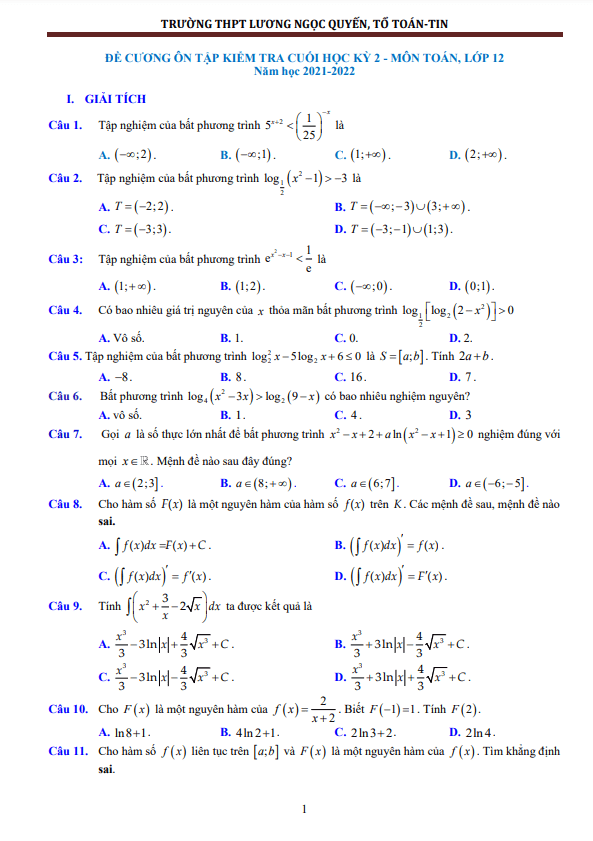 Đề cương giữa kỳ 2 Toán 12 năm 2021 – 2022 trường Lương Ngọc Quyến – Thái Nguyên