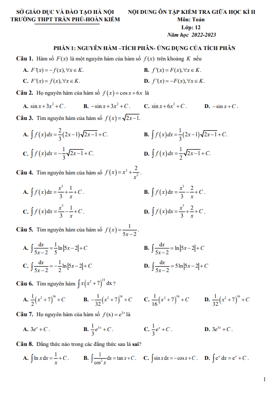Ôn tập giữa kì 2 Toán 12 năm 2022 – 2023 trường THPT Trần Phú – Hà Nội