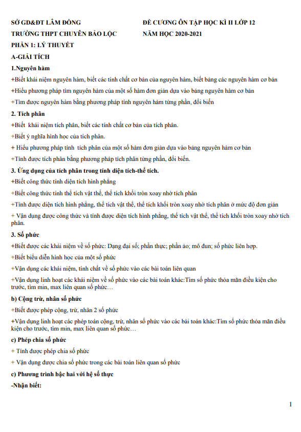 Đề cương HK2 Toán 12 năm 2020 – 2021 trường chuyên Bảo Lộc – Lâm Đồng
