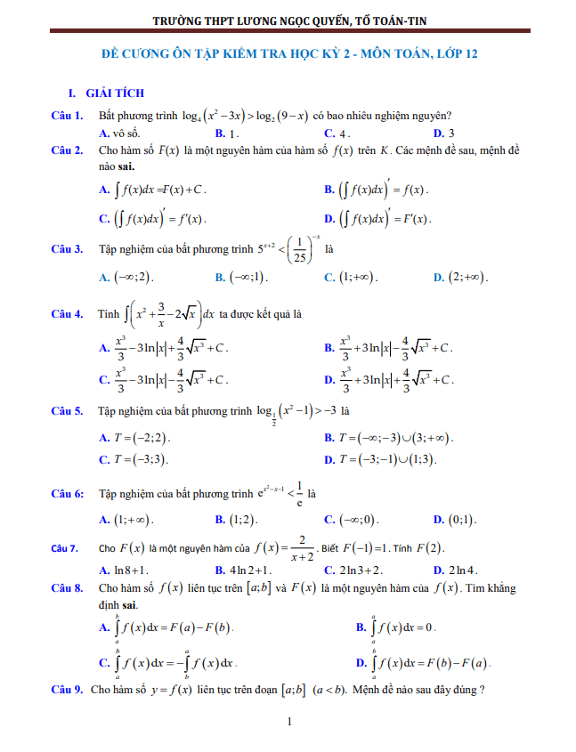 Đề cương HK2 Toán 12 năm 2020 – 2021 trường Lương Ngọc Quyến – Thái Nguyên
