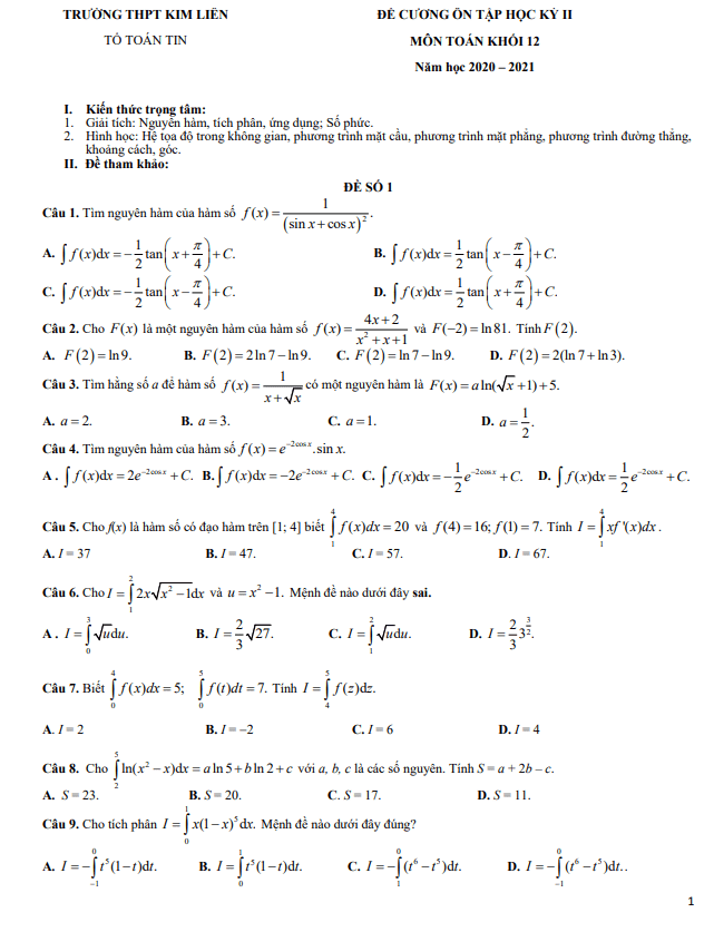 Đề cương ôn tập HK2 Toán 12 năm 2020 – 2021 trường THPT Kim Liên – Hà Nội