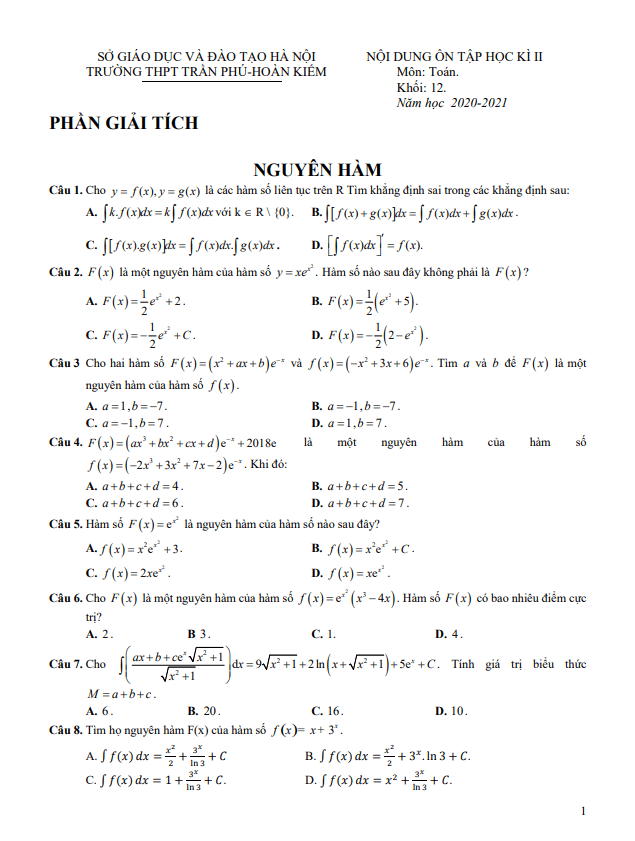 Nội dung ôn tập HK2 Toán 12 năm 2020 – 2021 trường THPT Trần Phú – Hà Nội
