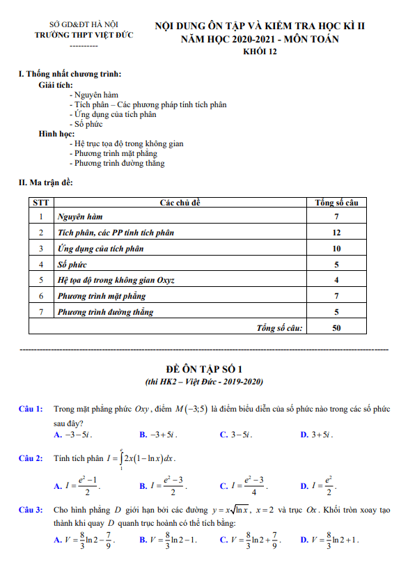 Nội dung ôn tập học kì 2 Toán 12 năm 2020 – 2021 trường THPT Việt Đức – Hà Nội
