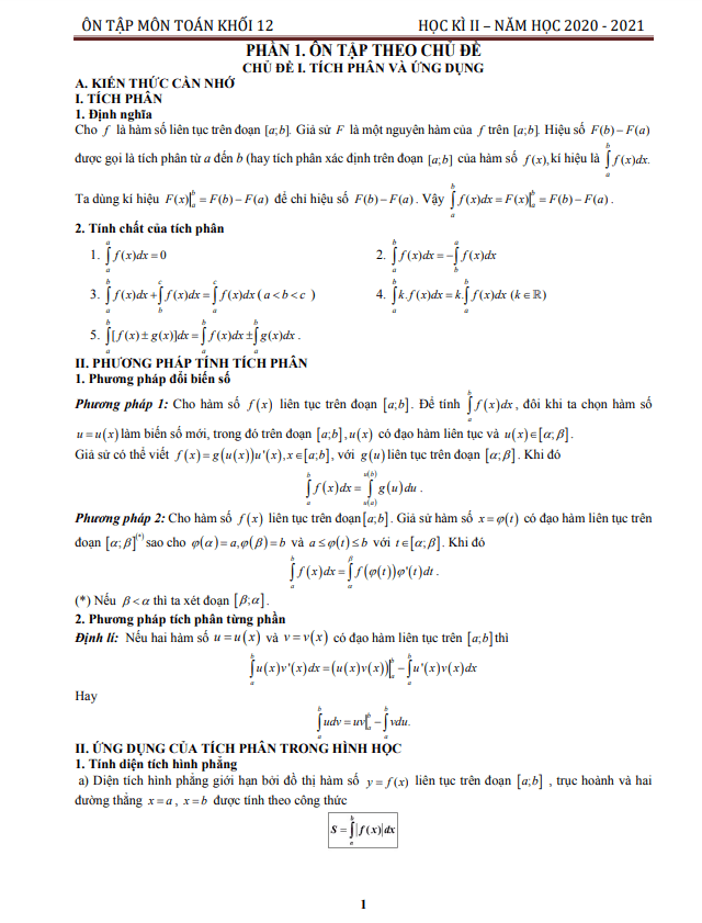 Đề cương HK2 Toán 12 năm 2020 – 2021 trường Phan Đình Phùng – Quảng Bình