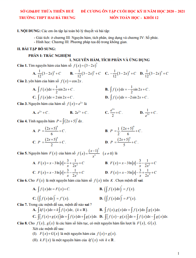Đề cương học kỳ 2 Toán 12 năm 2020 – 2021 trường THPT Hai Bà Trưng – TT Huế