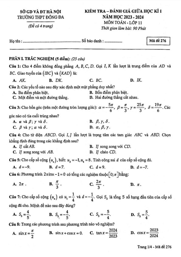 Đề giữa học kì 1 Toán 11 năm 2023 – 2024 trường THPT Đống Đa – Hà Nội