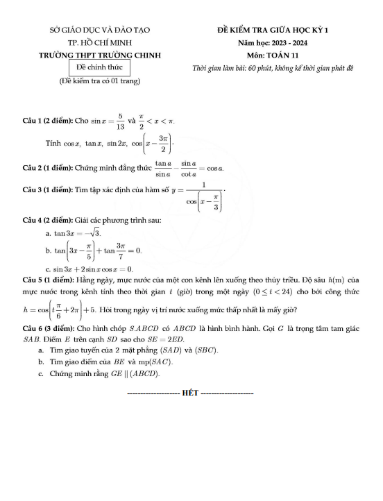 Đề giữa học kỳ 1 Toán 11 năm 2023 – 2024 trường THPT Trường Chinh – TP HCM