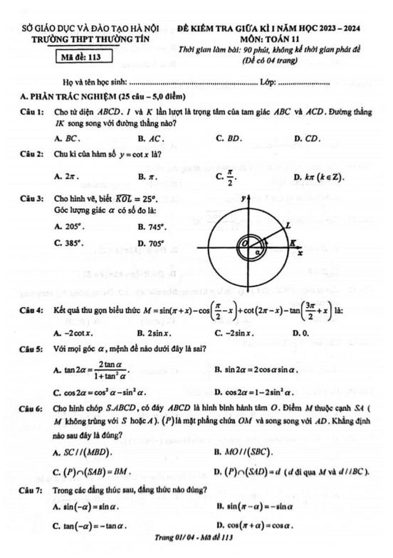 Đề giữa kì 1 Toán 11 năm 2023 – 2024 trường THPT Thường Tín – Hà Nội