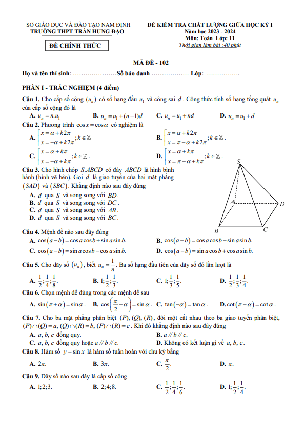 Đề giữa kỳ 1 Toán 11 năm 2023 – 2024 trường THPT Trần Hưng Đạo – Nam Định