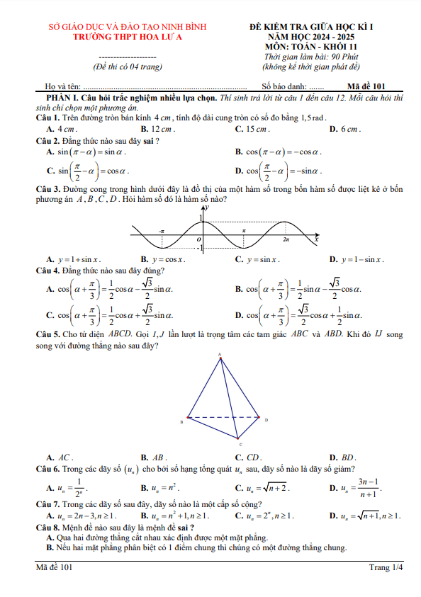 Đề giữa học kì 1 Toán 11 năm 2024 – 2025 trường THPT Hoa Lư A – Ninh Bình