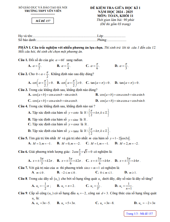 Đề giữa học kì 1 Toán 11 năm 2024 – 2025 trường THPT Yên Viên – Hà Nội