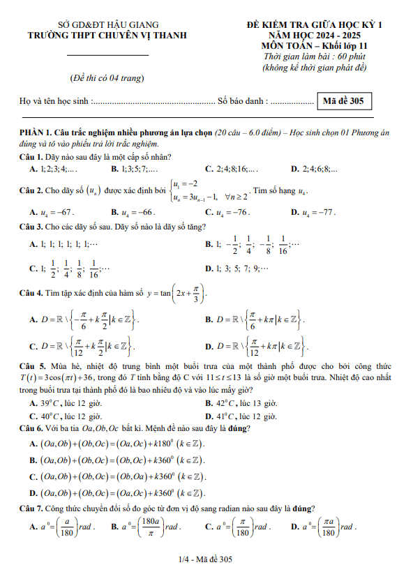 Đề giữa học kỳ 1 Toán 11 năm 2024 – 2025 trường THPT chuyên Vị Thanh – Hậu Giang