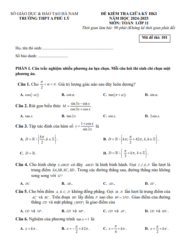 Đề giữa kì 1 Toán 11 năm 2024 – 2025 trường THPT A Phủ Lý – Hà Nam