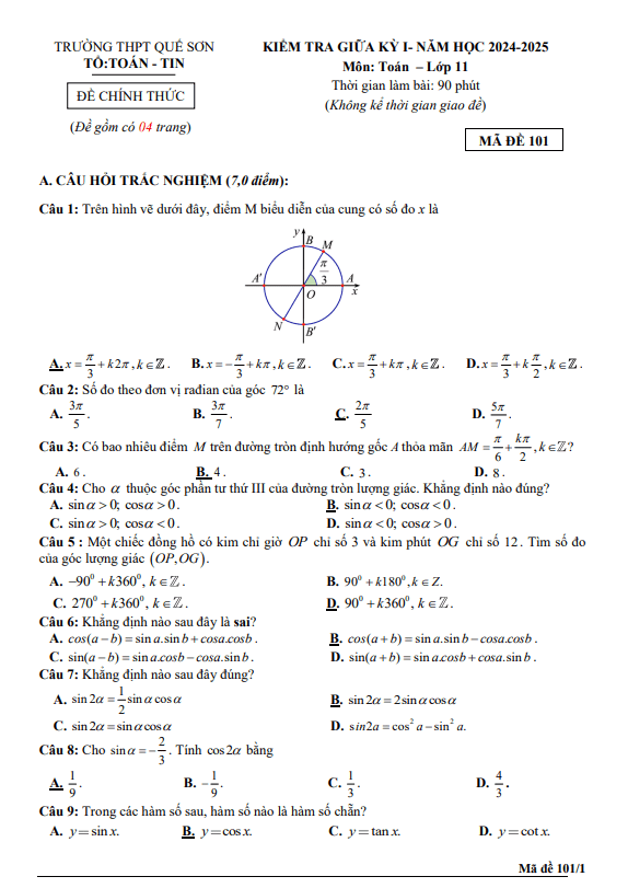 Đề giữa kỳ 1 Toán 11 năm 2024 – 2025 trường THPT Quế Sơn – Quảng Nam