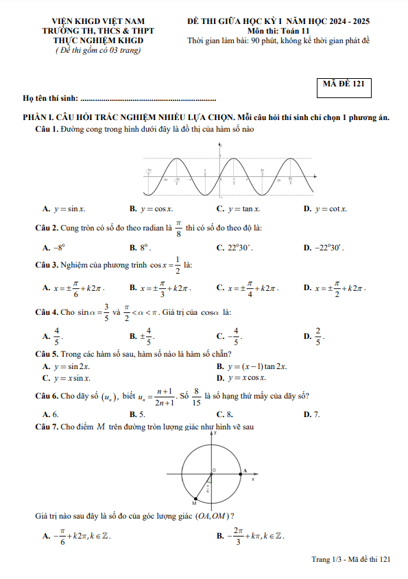 Đề giữa kỳ 1 Toán 11 năm 2024 – 2025 trường Thực Nghiệm Khoa Học Giáo Dục – Hà Nội