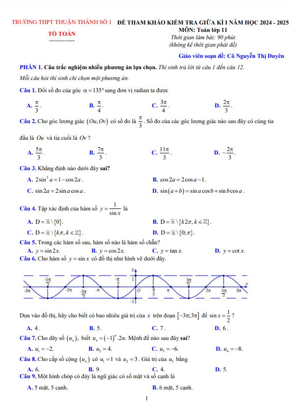 Đề tham khảo giữa kì 1 Toán 11 năm 2024 – 2025 trường THPT Thuận Thành 1 – Bắc Ninh