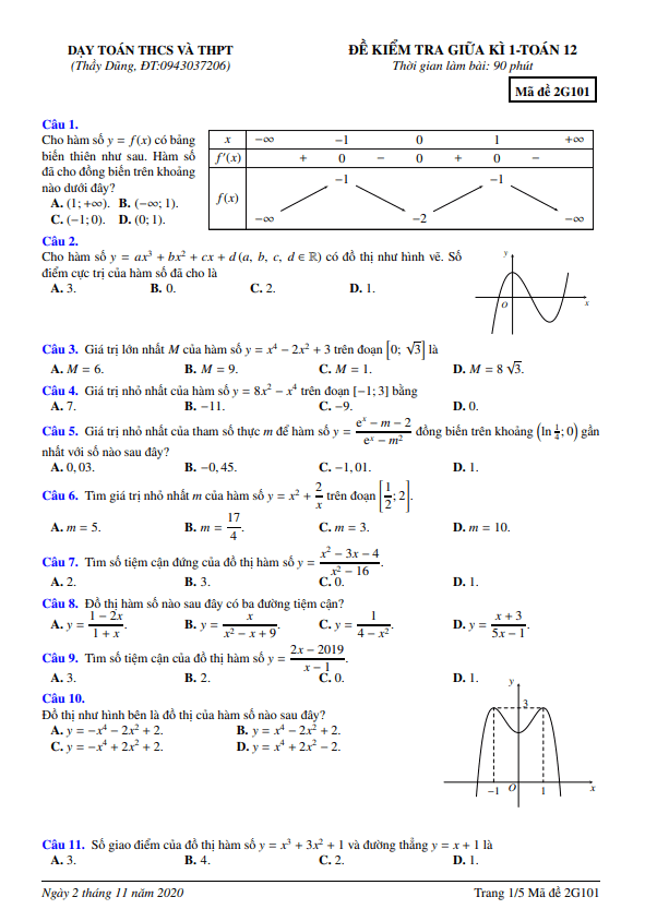 Đề thi giữa kì 1 Toán 12 năm 2020 – 2021 trường THPT Phan Đình Phùng – Hà Nội