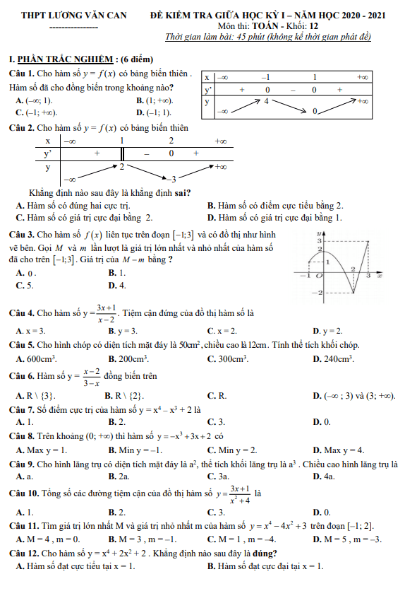 Đề kiểm tra giữa HK1 Toán 12 năm 2020 – 2021 trường THPT Lương Văn Can – TP HCM