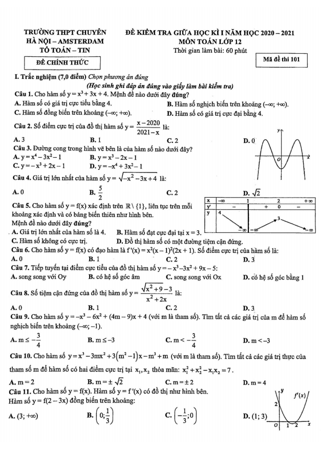Đề kiểm tra giữa học kì 1 Toán 12 năm 2020 – 2021 trường chuyên Hà Nội – Amsterdam