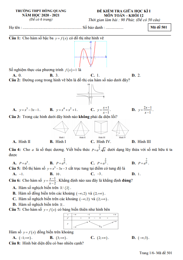 Đề kiểm tra giữa học kì 1 Toán 12 năm 2020 – 2021 trường THPT Hồng Quang – Hải Dương