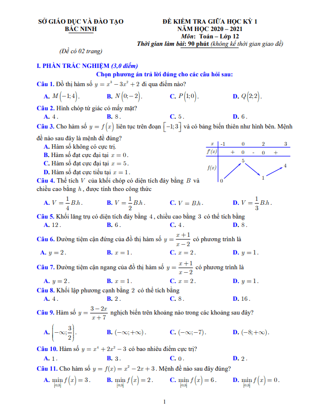Đề kiểm tra giữa học kỳ 1 Toán 12 năm 2020 – 2021 sở GD&ĐT Bắc Ninh