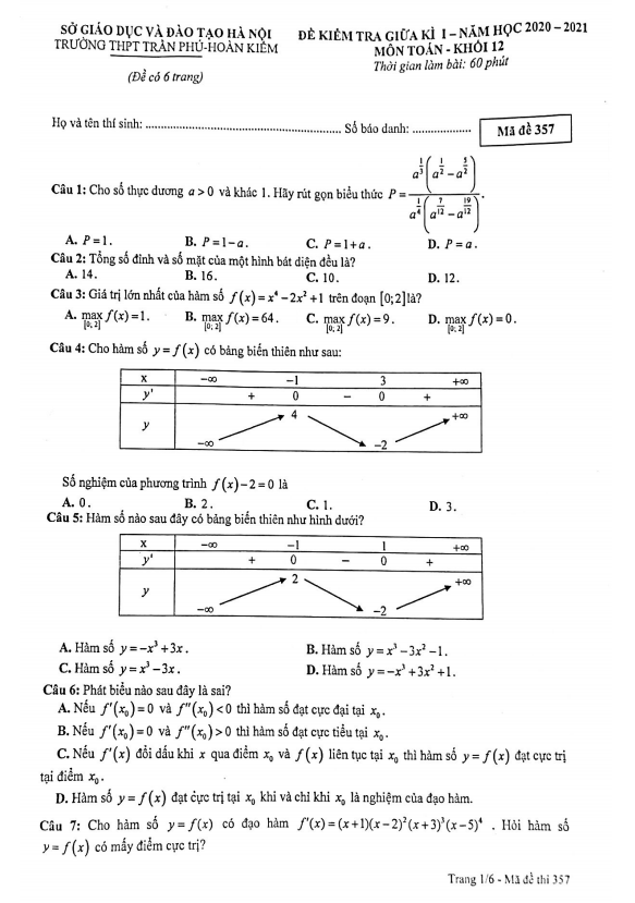 Đề kiểm tra giữa kì 1 Toán 12 năm 2020 – 2021 trường THPT Trần Phú – Hà Nội