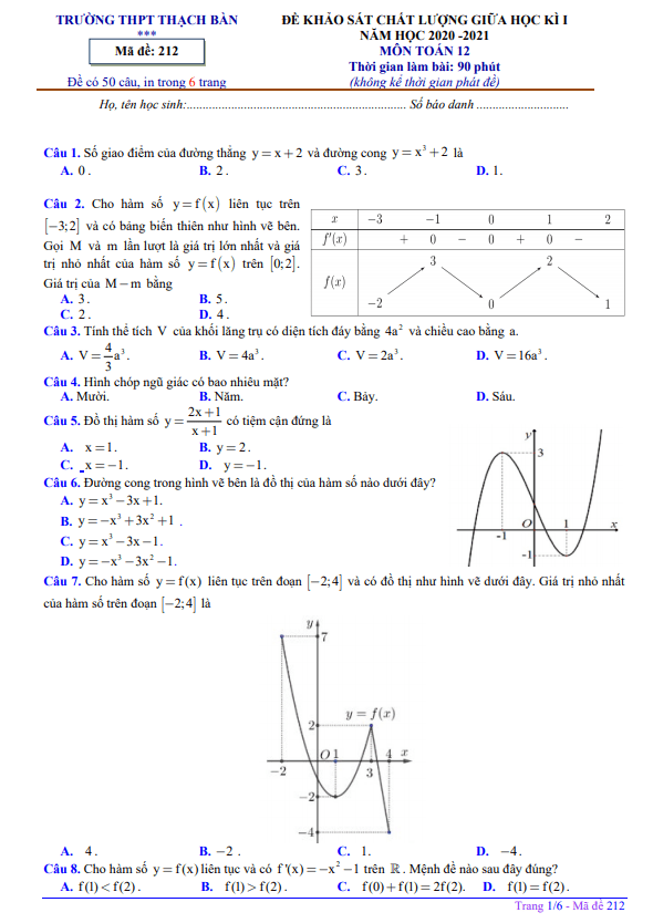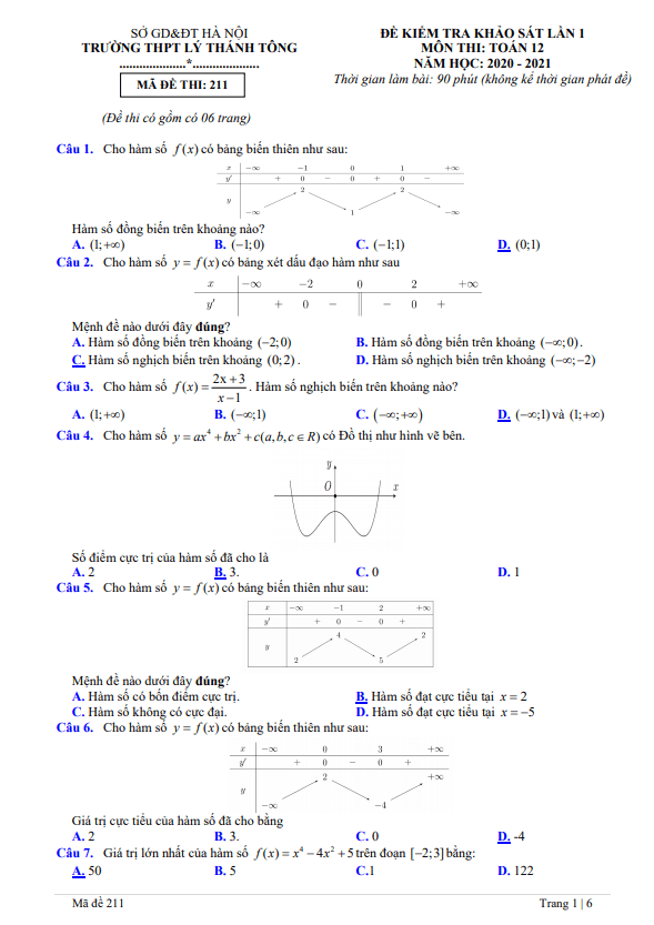 Đề kiểm tra Toán 12 lần 1 năm 2020 – 2021 trường THPT Lý Thánh Tông – Hà Nội
