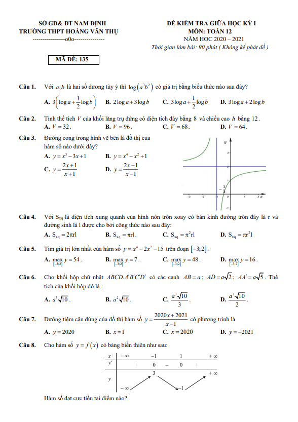 Đề thi giữa HK1 Toán 12 năm 2020 – 2021 trường THPT Hoàng Văn Thụ – Nam Định