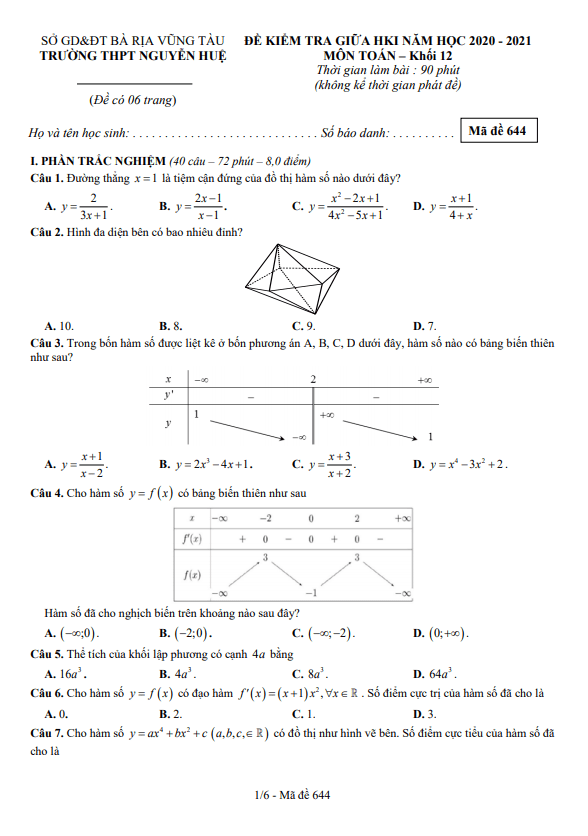 Đề thi giữa HK1 Toán 12 năm 2020 – 2021 trường THPT Nguyễn Huệ – Bà Rịa – Vũng Tàu