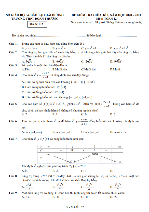 Đề thi giữa kì 1 Toán 12 năm 2020 – 2021 trường THPT Đoàn Thượng – Hải Dương
