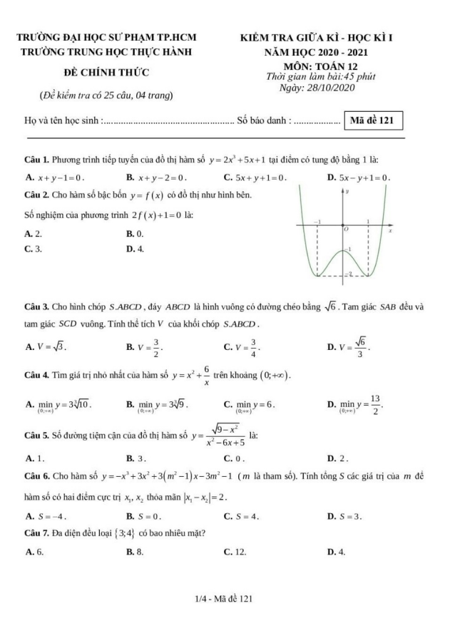 Đề thi giữa kì 1 Toán 12 năm 2020 – 2021 trường Trung học Thực hành ĐHSP – TP HCM