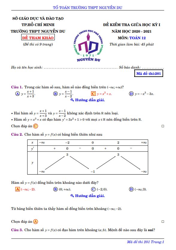 Đề thi tham khảo giữa HKI Toán 12 năm 2020 – 2021 trường THPT Nguyễn Du – TP HCM