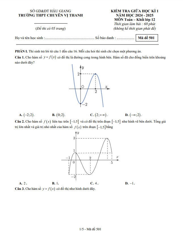 Đề giữa học kỳ 1 Toán 12 năm 2024 – 2025 trường THPT chuyên Vị Thanh – Hậu Giang