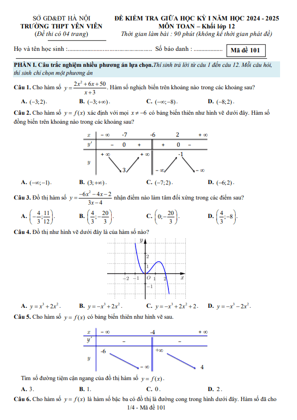 Đề giữa học kỳ 1 Toán 12 năm 2024 – 2025 trường THPT Yên Viên – Hà Nội