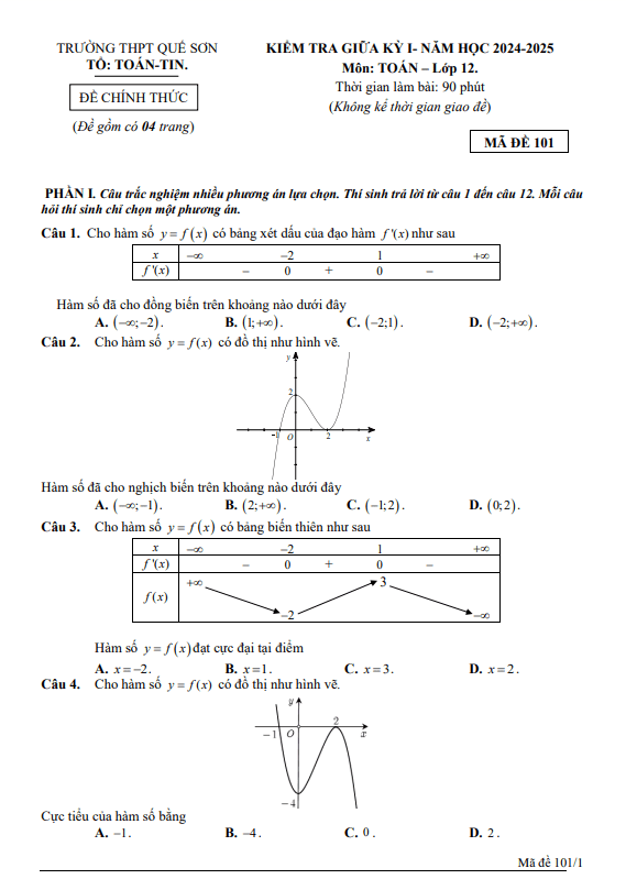 Đề giữa kỳ 1 Toán 12 năm 2024 – 2025 trường THPT Quế Sơn – Quảng Nam
