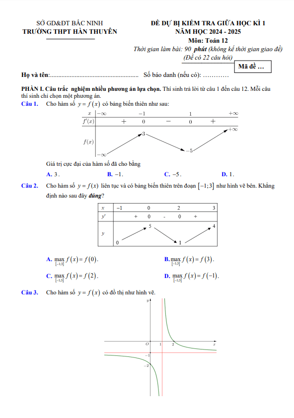 Đề dự bị giữa kì 1 Toán 12 năm 2024 – 2025 trường THPT Hàn Thuyên – Bắc Ninh