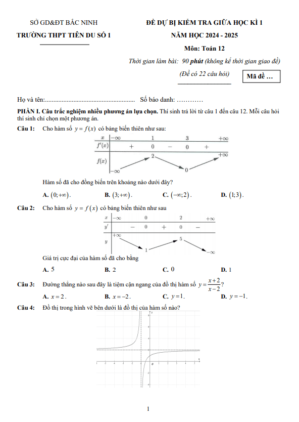 Đề dự bị giữa kì 1 Toán 12 năm 2024 – 2025 trường THPT Tiên Du 1 – Bắc Ninh