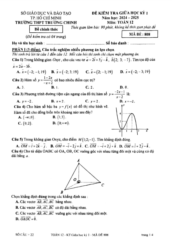 Đề giữa học kỳ 1 Toán 12 năm 2024 – 2025 trường THPT Trường Chinh – TP HCM