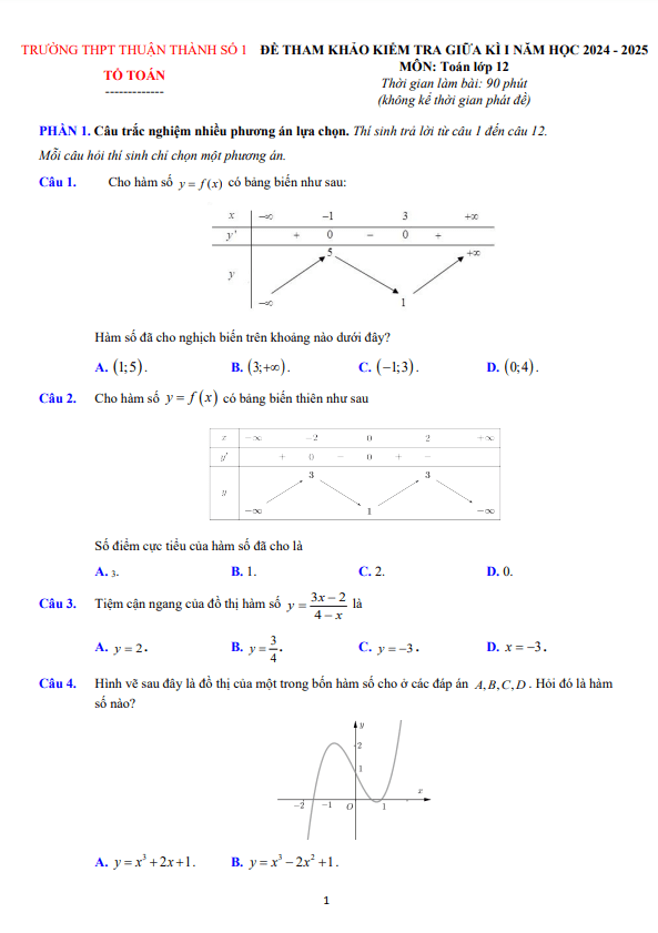 Đề tham khảo giữa kì 1 Toán 12 năm 2024 – 2025 trường THPT Thuận Thành 1 – Bắc Ninh