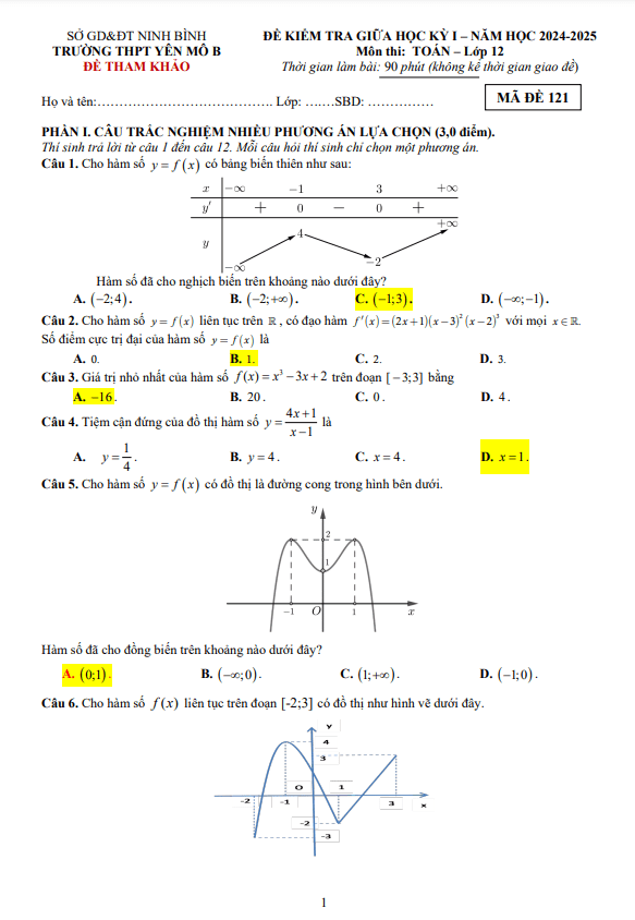 Đề tham khảo giữa kỳ 1 Toán 12 năm 2024 – 2025 trường THPT Yên Mô B – Ninh Bình